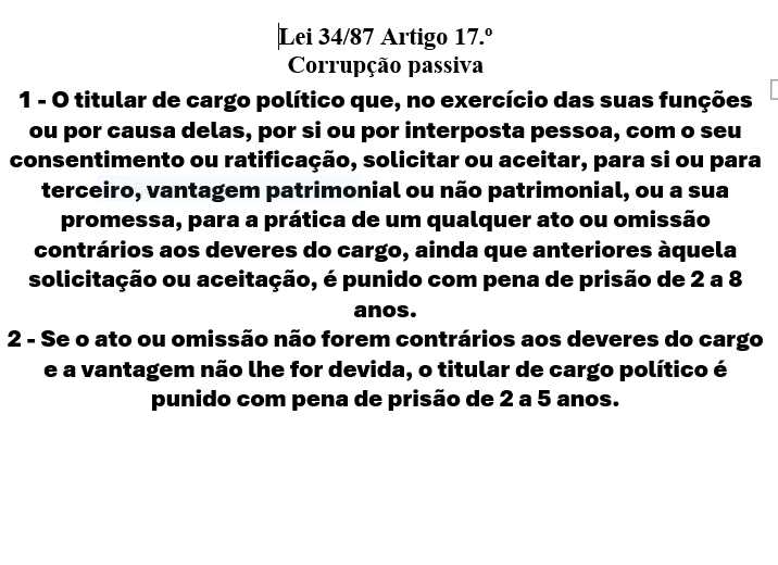 contra a paz e a humanidade, tráfico de influência, favorecimento pessoal , denegação de justiça, prevaricação, corrupção, peculato, participação económica em negócio, abuso de poder, fraude, ambientais